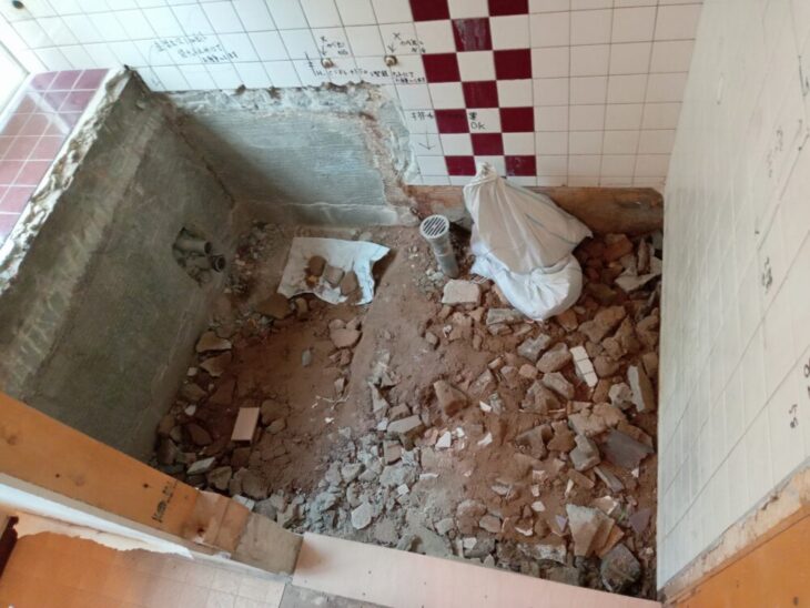 土間タイルの下に配管が埋設してあることもあるので、注意して解体します。