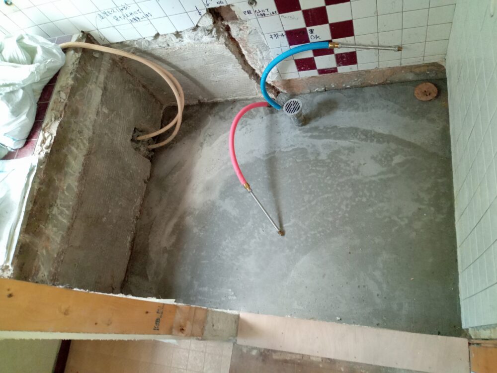 【土間コン打設】新規ユニットバスを安定して設置させるために、床をコンクリートで平らにします。