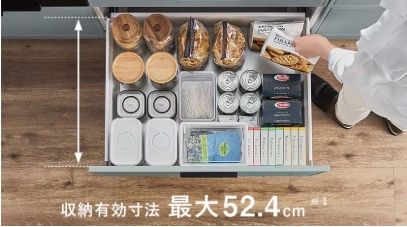 ★調理台用キャビネットは、ロングスライドで奥行いっぱい使える大容量。