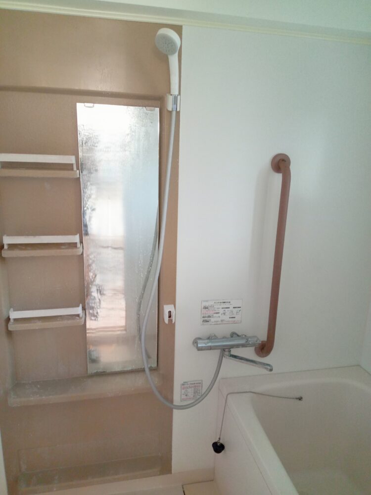 特に鏡には水垢が目立ち、浴室全体が少し暗い印象です。