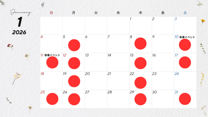 1月のリフォームスタジオの営業日のお知らせです。●の日が営業日です。